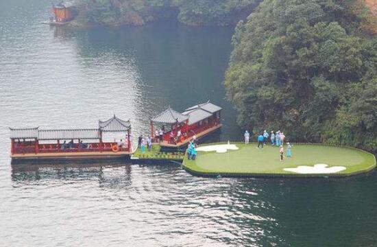 2、营销亮点:一杆进洞悬赏百万。风景如画的特色场地:以山头悬崖做球台,湖面中心设果岭,发球台与果岭间的直线距离200余米,高低落差80余米。